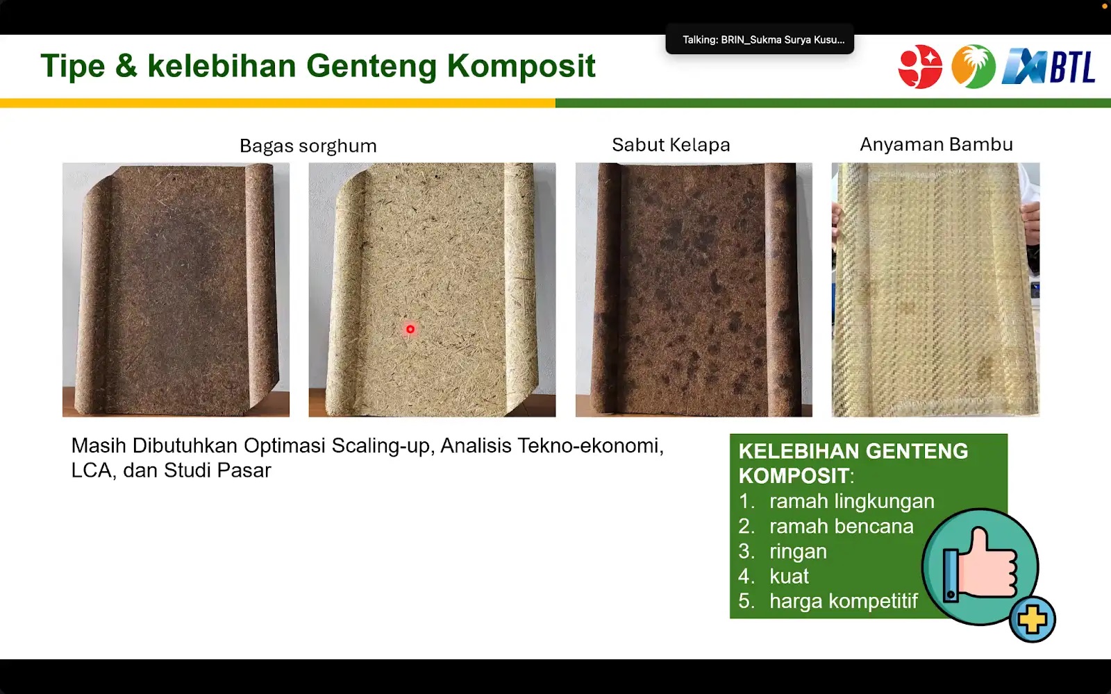 Melalui kegiatan webinar tersebut, BRIN berharap inovasi genting komposit berbasis biomassa dapat terus dikembangkan melalui kolaborasi dengan mitra industri. Dengan demikian, produk hasil riset ini diharapkan dapat dimanfaatkan secara luas oleh masyarakat sekaligus mendukung pengembangan material bangunan yang lebih aman dan berkelanjutan di Indonesia.