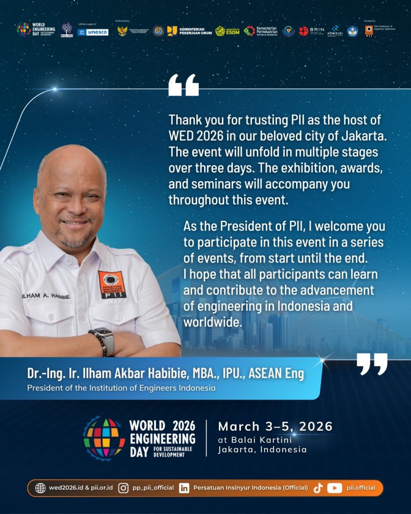 Jakarta, (2/2/2026) – Indonesia menjadi tuan rumah perayaan World Engineering Day (WED) 2026, dengan Persatuan Insinyur Indonesia (PII) sebagai penyelanggara pada 3-5 Maret 2026 di Jakarta.