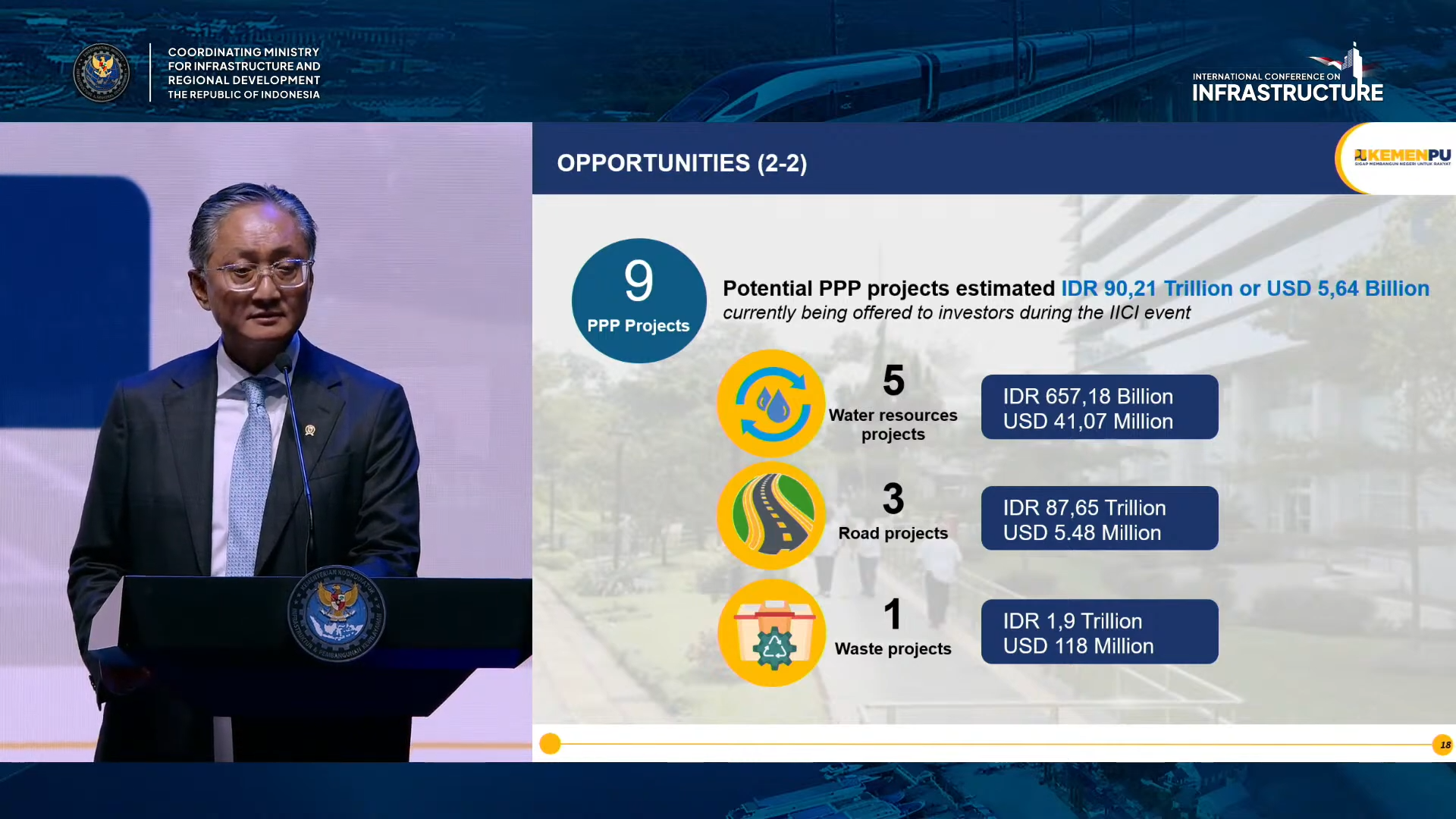 Adapun sembilan proyek infrastruktur yang ditawarkan ini terdiri dari lima proyek Sumber Daya Air (SDA) senilai Rp 657,18 miliar, tiga proyek jalan tol senilai Rp 87,65 triliun, dan satu proyek pengelolaan limbah senilai Rp 1,9 triliun.